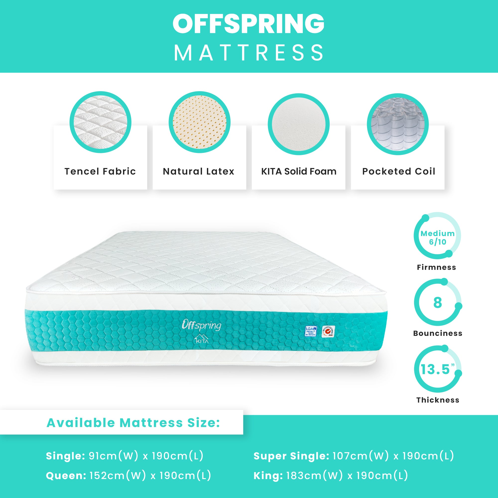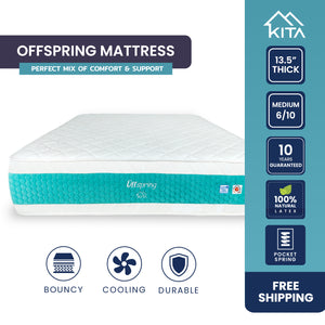 KITA prides itself on offering simple and honest mattresses without making exaggerated claims about being the "best" or using complex technology. We understand that the best mattress for you is one that meets your unique needs and preferences. Our OFFSPRING mattress is designed with six key features in mind: Low Disturbance, Durable, Safe, Bouncy, Temperature Regulated and Edge Support.