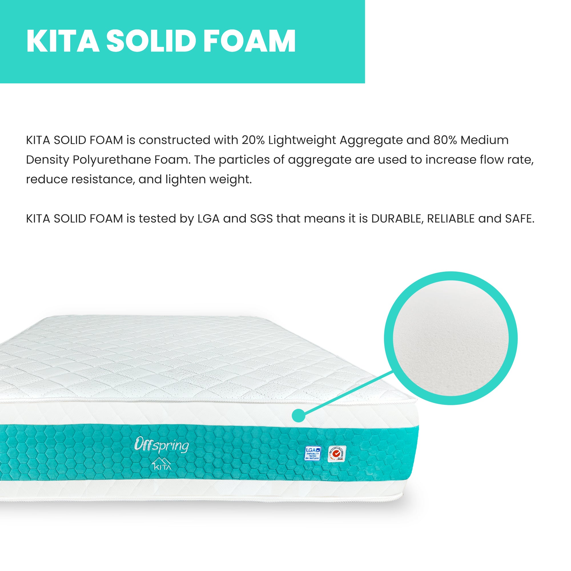 KITA OFFSPRING mattress has a base of KITA SOLID FOAM above pocketed coil, which is significantly more durable than rebond foam commonly used in other mattresses. It offers better weight distribution and pressure point relief.